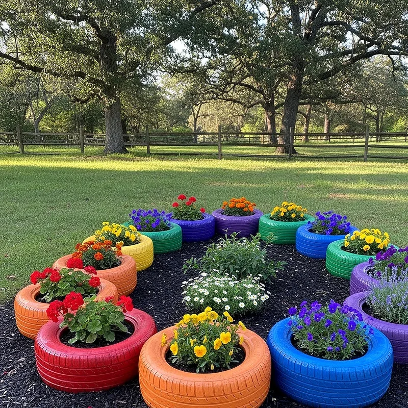 Using tires around tree bases helps protect roots and adds decorative charm. Fill the tire with mulch, stones, or flowering plants.